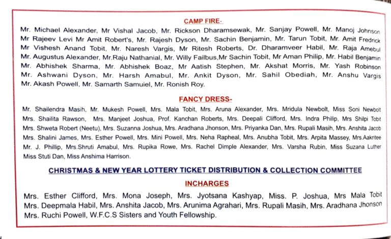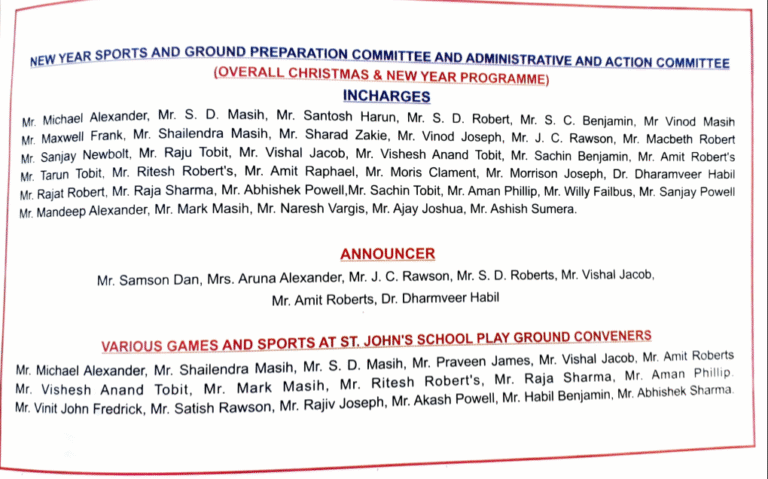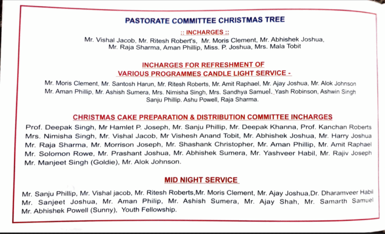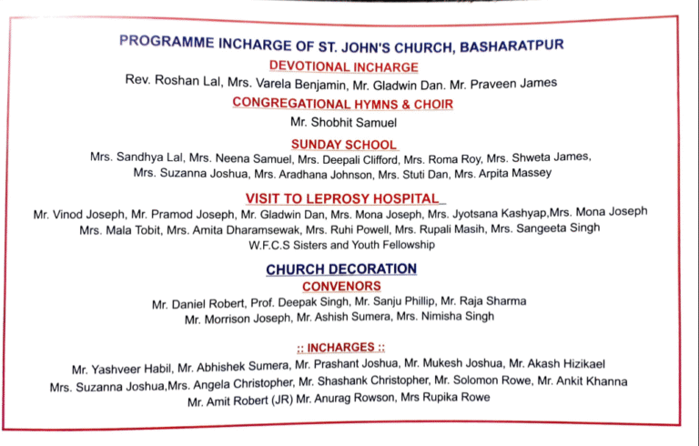 St. John’s Church, Basharatpur, Gorakhpur is under Diocese of Lucknow (CNI) therefore presbyters, lay readers are appointed through the Diocese. The Pastorate Committee are elected by the registered members of the Church.